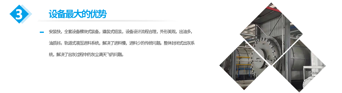公司生產的設備的優(yōu)勢:安裝快,全套設備模塊式裝備,撬裝式組裝,設備設計流程合理,外形美觀,出油多,油質好。軌道式液壓進料系統,解決了進料慢,進料少的傳統問題。整體封閉式出灰系統,解決了出灰過程中的灰塵滿天飛的問題。